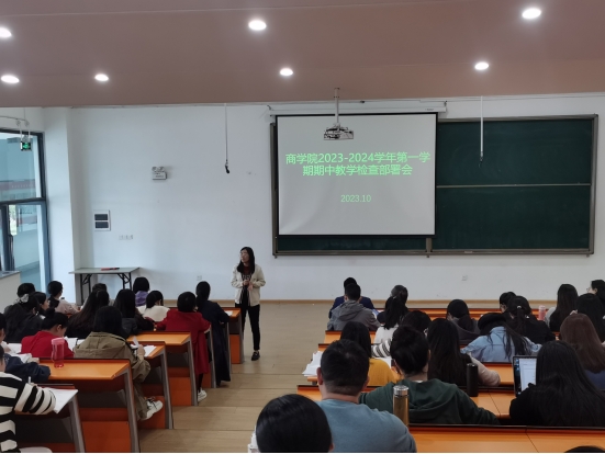 10月26日下午,商学院在教学二号楼116教室召开2023-2024学年第一学期期中教学检查部署会,院长白朋飞、教学秘书马巧丽及全体教师参加此次会议。
