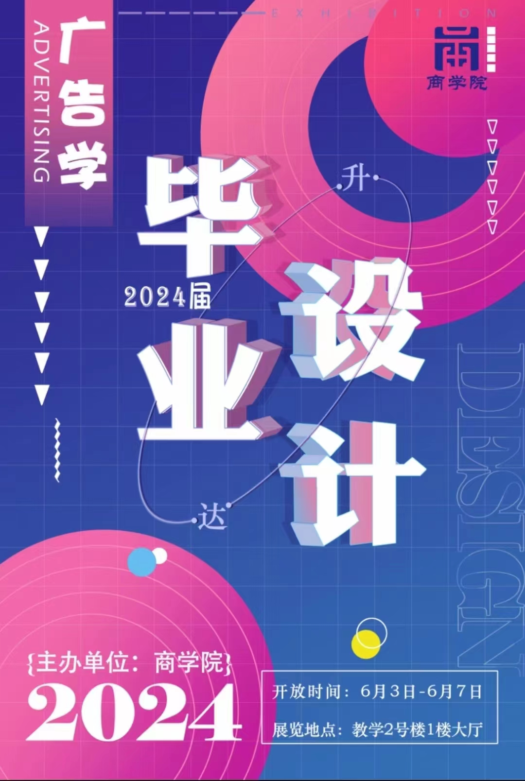 为展示商学院广告学专业教学质量和教学成果,拟在学校教学二号楼一楼大厅举办商学院2024届广告学专业毕业设计展,现将有关事项通知如下: