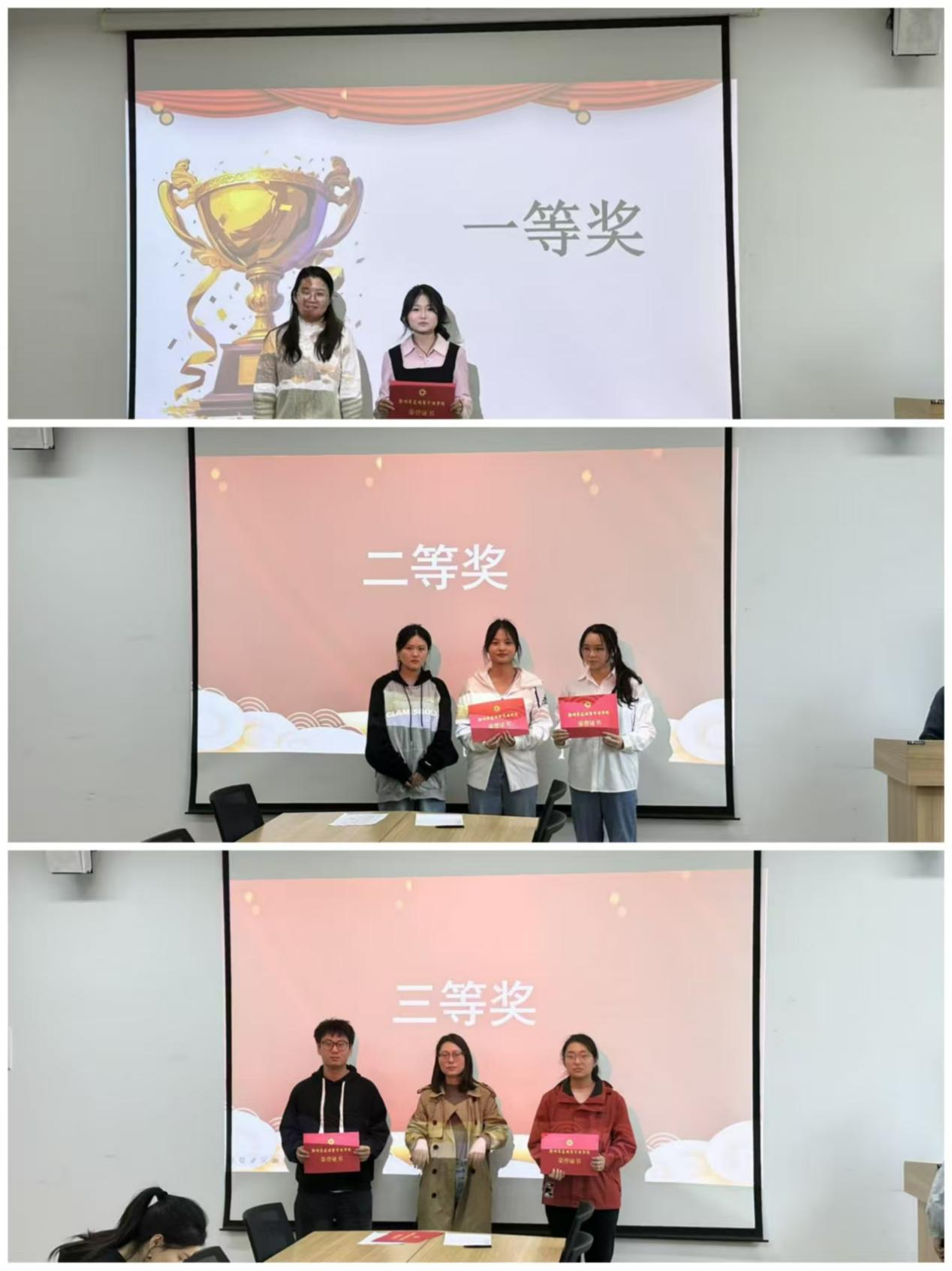 每位选手演讲结束后,评委老师分别从内容深度、语言表达和现场感染力等方面进行现场打分。经过激烈角逐,本次比赛最终评选出一等奖1名、二等奖2名、三等奖2名。颁奖环节中,张艺培老师、李佩老师和张姣玉老师分别为获一、二、三等奖的选手颁发了奖状。