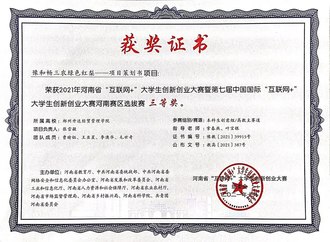 第七届中国国际“互联网+”大学生创新创业大赛以“我敢闯、我会创”为主题,围绕“更中国、更国际、更教育、更全面、更创新”的办赛目标,以赛促教、以赛促学、以赛促新,旨在培养创新创业主力军,探索人才培养新途径,为国家及地方社会发展培育优质创业复合型人才。2021年7月21日至22日,“建行杯”2021年河南省“互联网+”大学生创新创业大赛暨第七届中国“互联网+”大学生创新创业大赛选拔赛在河南师范大学举行。经过前期省内各高校的层层选拔,商学院电子商务专业学生团队报送的“豫和畅“三农”绿色红梨”获得省赛三等奖。