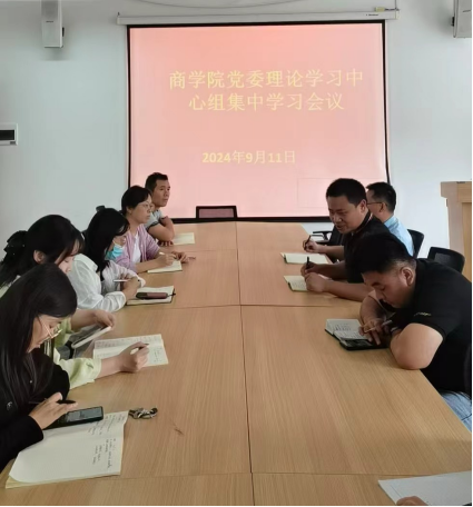 9月11日下午,商学院党委在教学楼2号楼315会议室召开理论学习中心组扩大会议,集体学习党的二十届三中全会精神。商学院党委书记郭峰、院长白朋飞、行政秘书郗艳花、教学秘书马巧丽、学院各党支部书记参加本次会议。