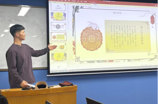首先,由团支书通过精心准备的课件和视频展示,让同学们深入了解中秋节的由来、传统习俗和文化内涵。为了让同学们更深刻的感受中秋节的文化魅力,班级还开展了中秋诗词朗诵比赛。同学们声情并茂地朗诵着经典的中秋诗词,如“但愿人长久,千里共婵娟”“海上生明月,天涯共此时”。等,在优美的诗句中领略传统文化的魅力。随后,进行了传统手工制作学习活动。同学们通过观看制作月饼和中秋花灯的视频,在体验传统技艺的过程中,感受古人的智慧和创造力。