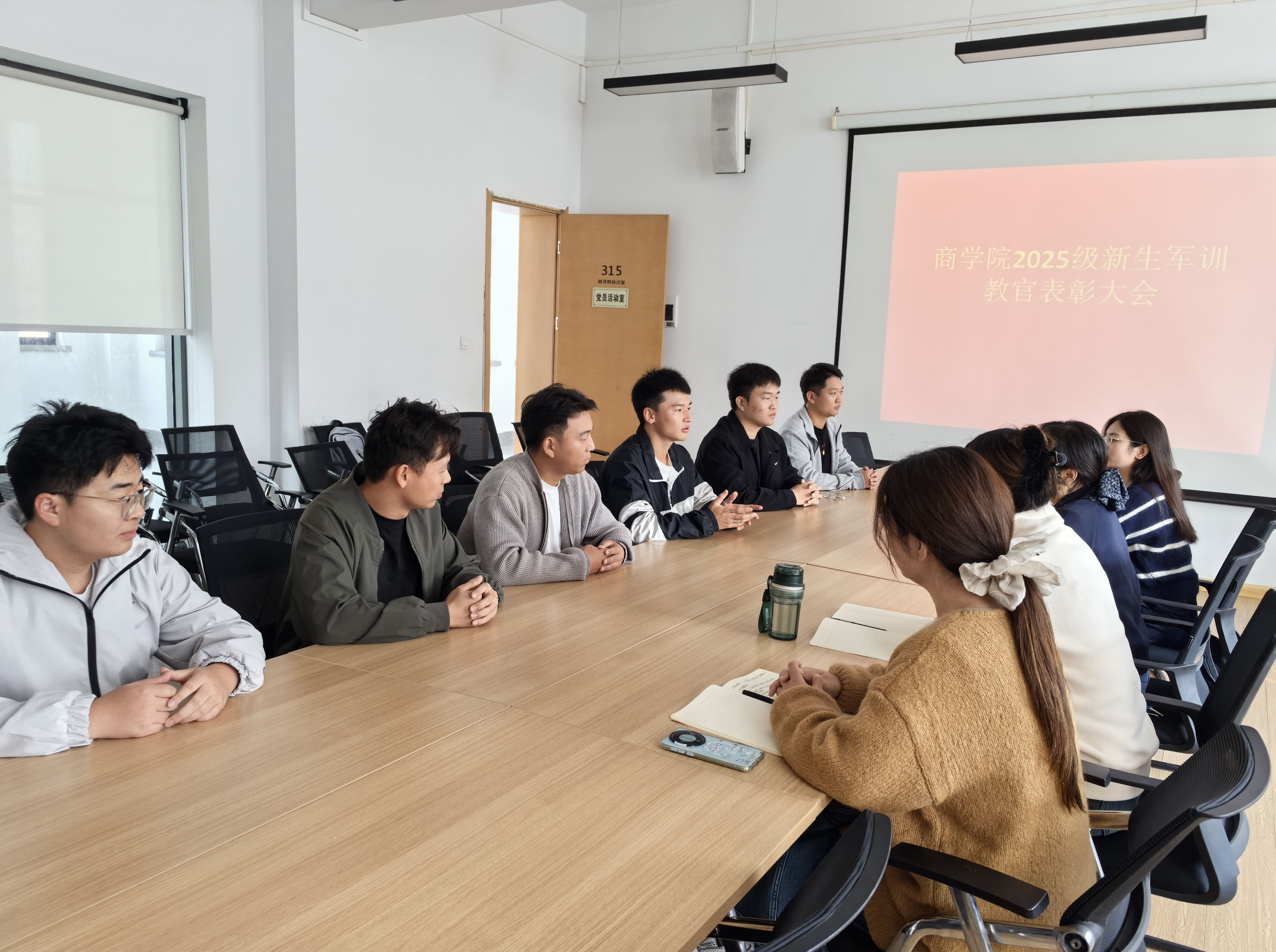 为表彰在2025级新生军训工作中表现突出的教官,弘扬他们吃苦耐劳、严谨负责的奉献精神,10月14日13:30,商学院在教学2号楼315会议室隆重举行军训教官表彰大会。商学院党委副书记郗艳花、团委副书记张艺培、征兵专员刘琳琳、辅导员曹佳丽和李培以及宋征军、崔长宇等六位新生军训教官共同出席了本次大会。