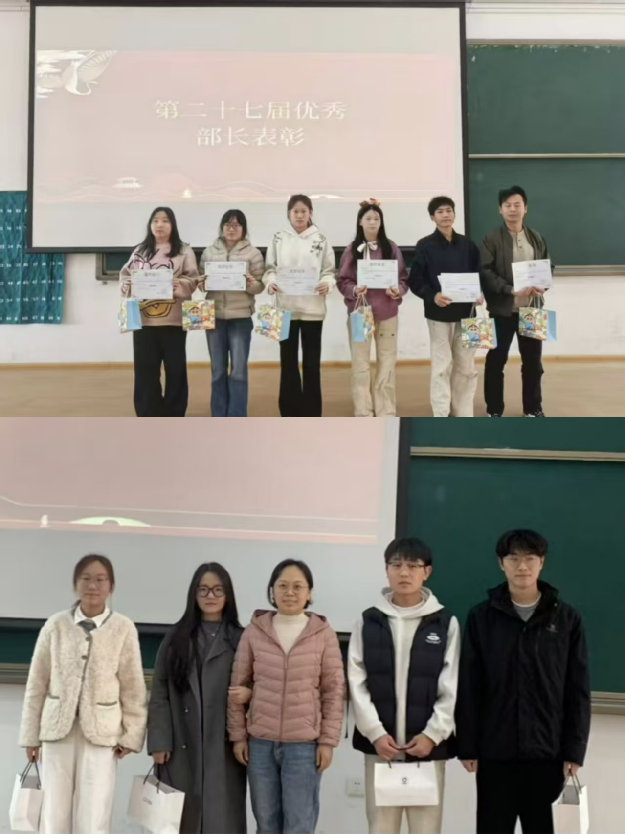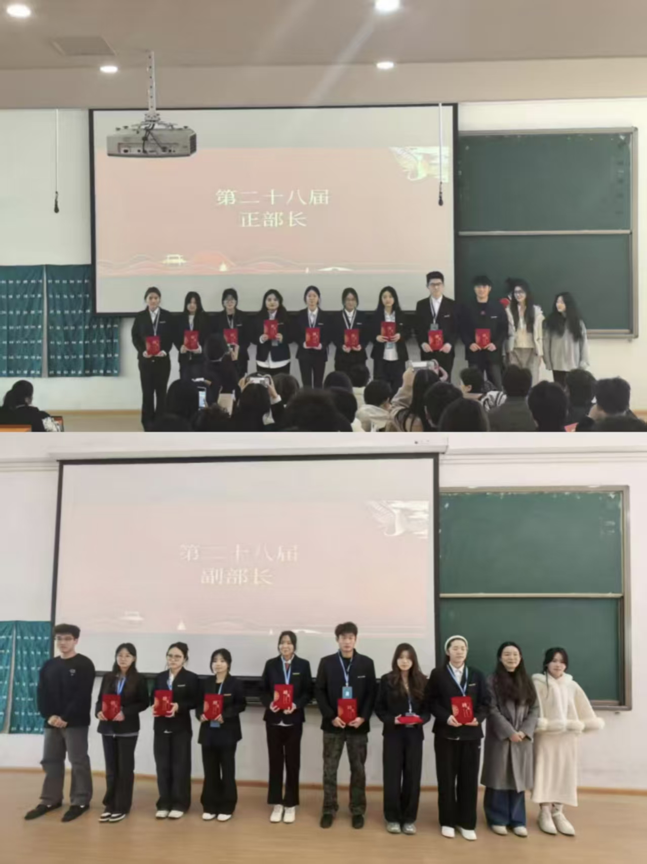 颁奖环节后,优秀部长代表和新任干事代表依次发言。第二十七届优秀部长代表陈赟晗结合自身工作经历,鼓励同学们在应对挑战中收获成长,将困难转化为宝贵经验。新任干事代表赵宏丽表达了她积极学习、踏实履职的决心,部长代表王建平承诺将以饱满热情履行新使命,主席团代表周静怡提出新一届团学组织将以"三个坚持"为核心,切实做好服务工作。