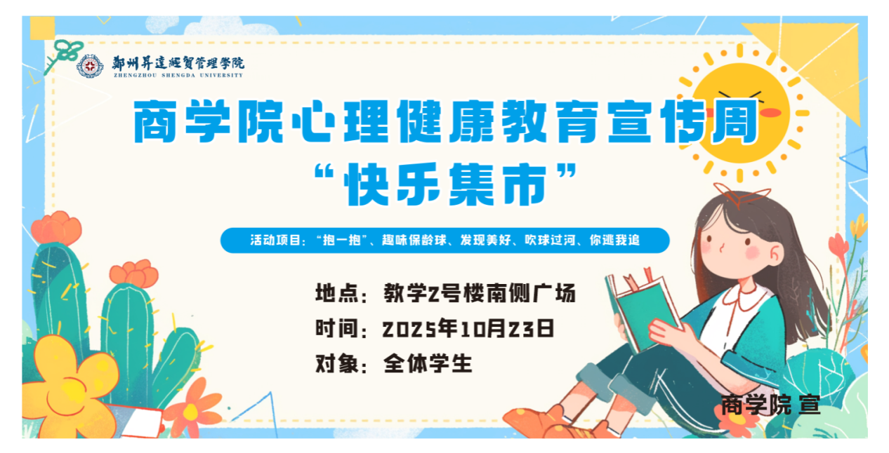 为全面贯彻心理健康教育理念,帮助学生有效释放压力、调节情绪,营造积极健康的校园心理氛围,商学院于2025年10月23日在教学2号楼南侧小广场成功举办以“快乐集市”为主题的心理健康教育宣传周活动。本次活动面向...[详细]